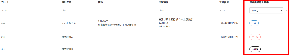 ・一致:適格請求書発行事業者公表サイトに一致する登録番号が存在する場合