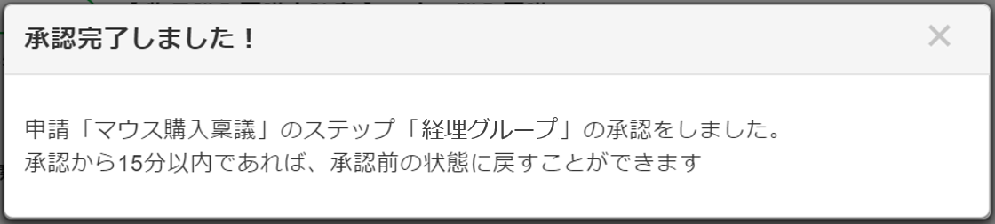 3. クリックと同時に承認完了となった申請書が表示され、以下のダイアログが表示されます。