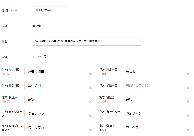 経費精算や支払依頼の申請時に選択された「内訳」に紐付く勘定科目等が、計上仕訳の「借方」に自動反映されます。