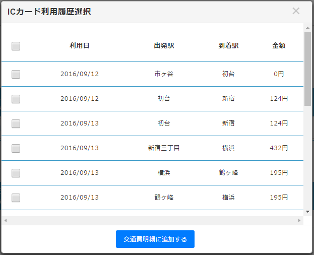 5. どの履歴を取り込むかを選択する画面で、交通費明細に反映させたい乗換履歴にチェックを入れます。