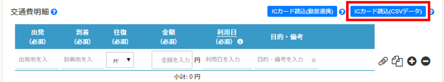 3. 交通費明細右上の「ICカード読込(CSVデータ)」ボタンをクリックします。