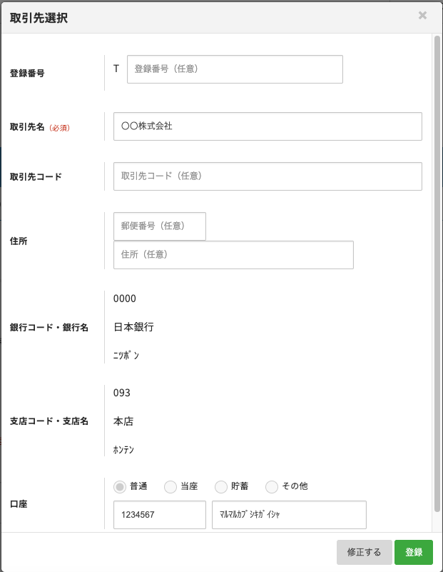 5. 確認画面が表示されますので、内容を確認して「登録」をクリックすると、取引先として登録することができます。