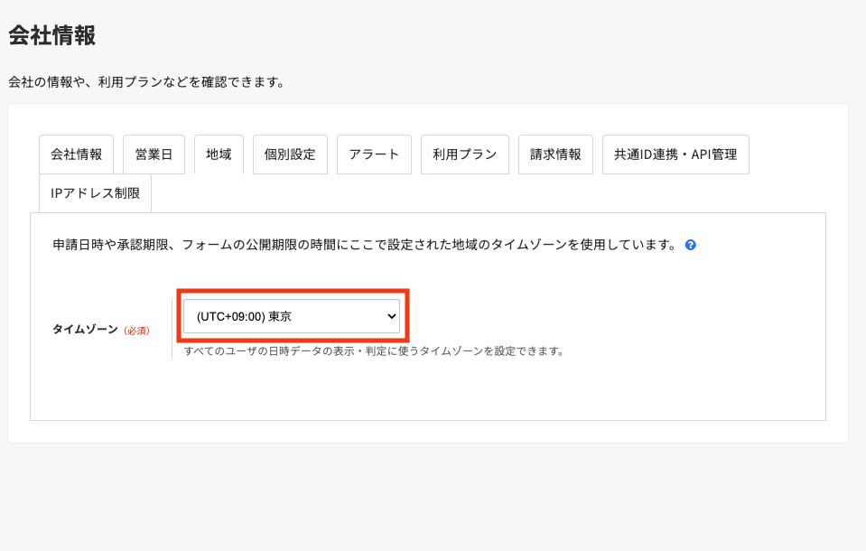 ジョブカン経費精算/ワークフローで利用しているアカウントのタイムゾーンを確認、設定することができます。