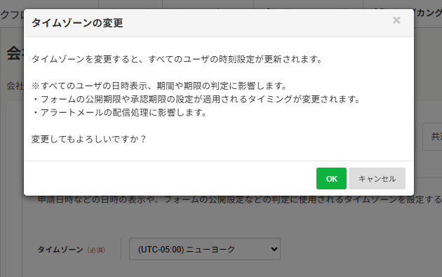 2. 表示された確認ダイアログの「OK」ボタンをクリックすると、タイムゾーンの設定が変更されます。