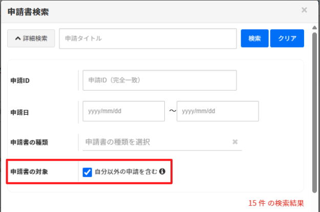 「自分以外の申請を含む」にチェックをつけると、他のユーザの申請(自身が承認者である申請、