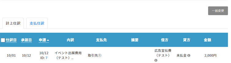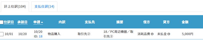 「仕訳日」「承認日」「申請」をクリックすると、表示の昇順・降順を入れ替えることができます。