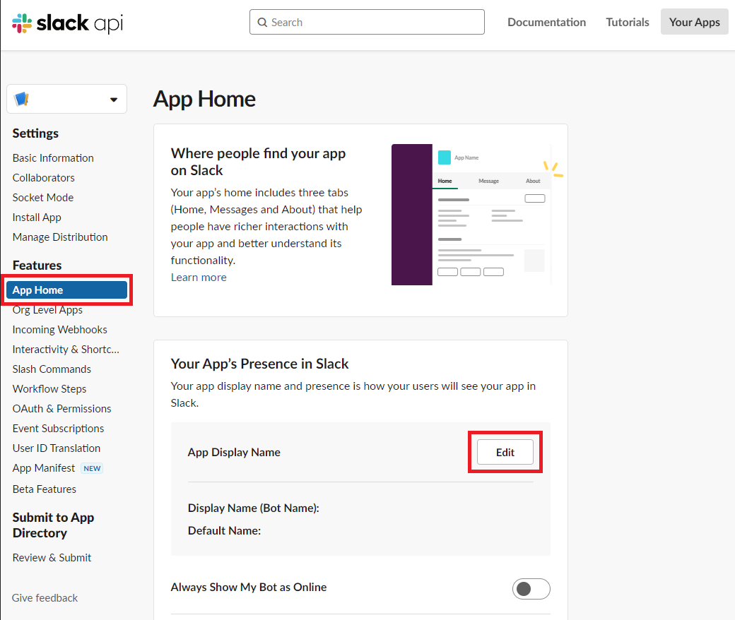 10. 「App Home」をクリックして「Edit」をクリックします。