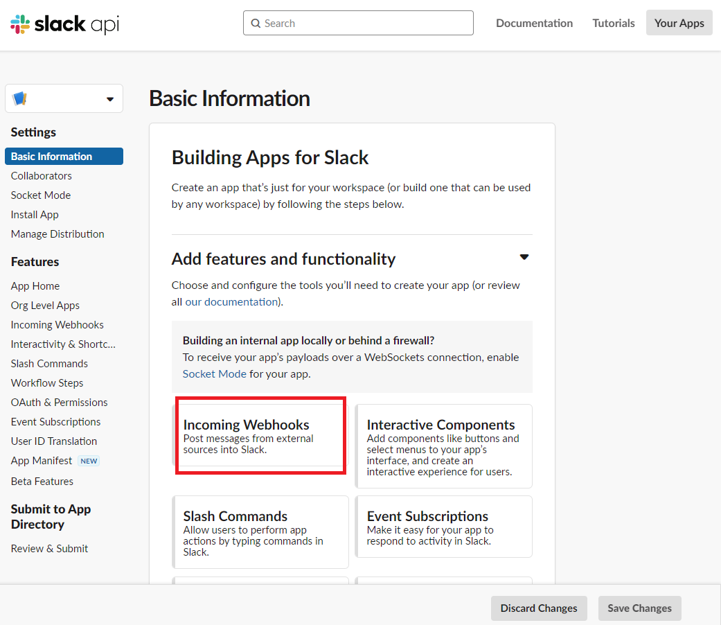 12. 「Incoming Webhooks」をクリックして、画面下部の「Add New Webhook to Workspace」をクリックします。