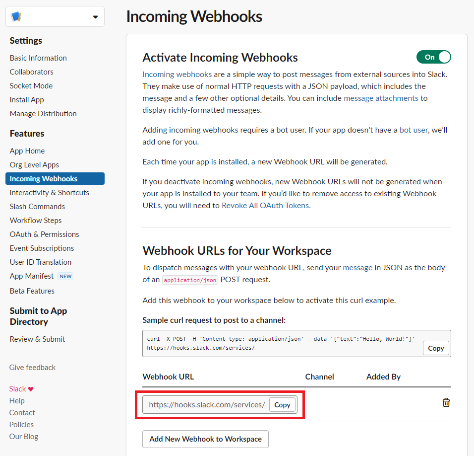 8. 「Activate Incoming Webhooks」のスイッチを「On」にし、画面下部の「Add New Webhook to Workspace」をクリックします。