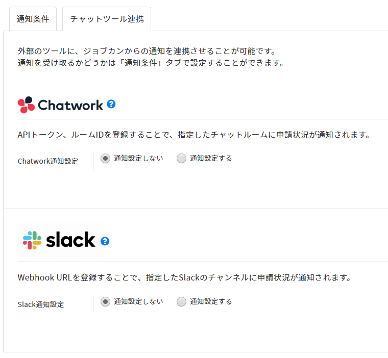 ChatworkやSlackの設定画面が表示されます。
